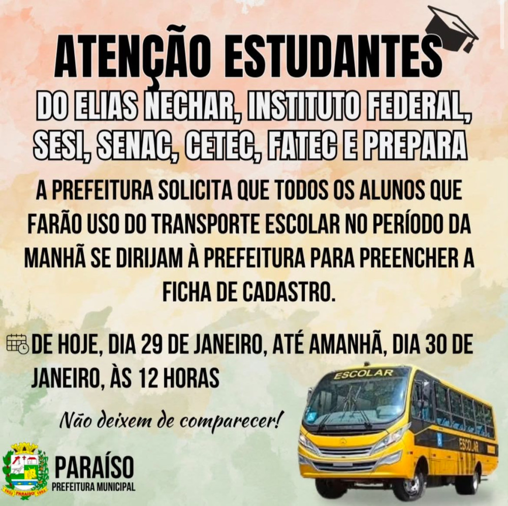 A Prefeitura de Paraíso, por meio do prefeito Osvalte Bovoni, solicita que todos os alunos que farão uso do transporte escolar no período da manhã se dirijam à Prefeitura para preencher a ficha de cadastro. O atendimento ocorrerá de hoje, dia 29 de janeiro, até amanhã, dia 30 de janeiro, às 12 horas, para os estudantes das seguintes escolas: Elias Nechar, Instituto Federal, Sesi, Senac, CETEC, Fatec e Prepara.