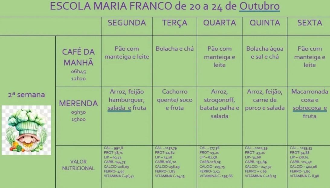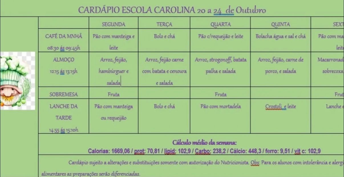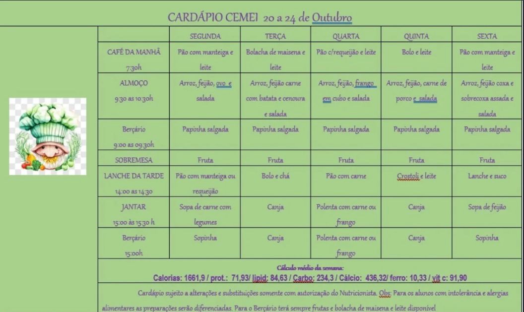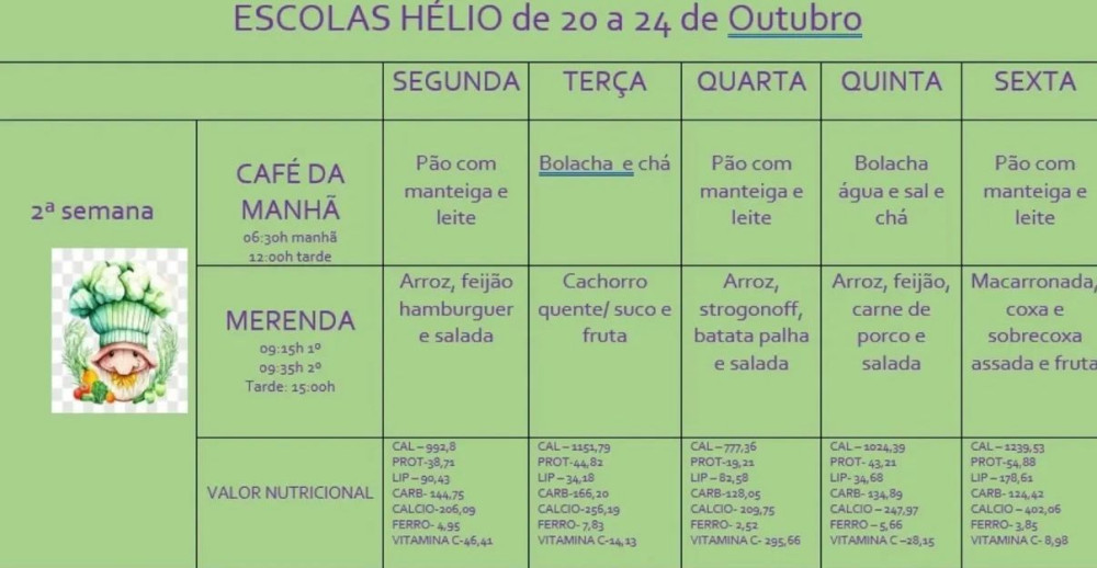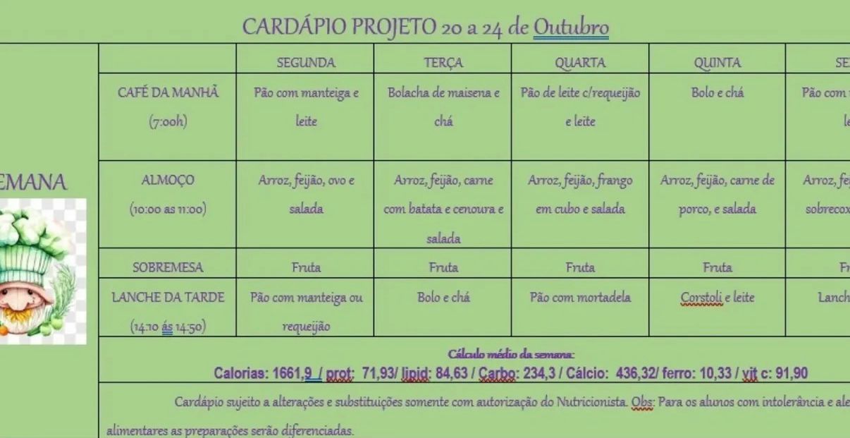 Cardápio Escolar da Semana (20 a 24/10) já está no ar.