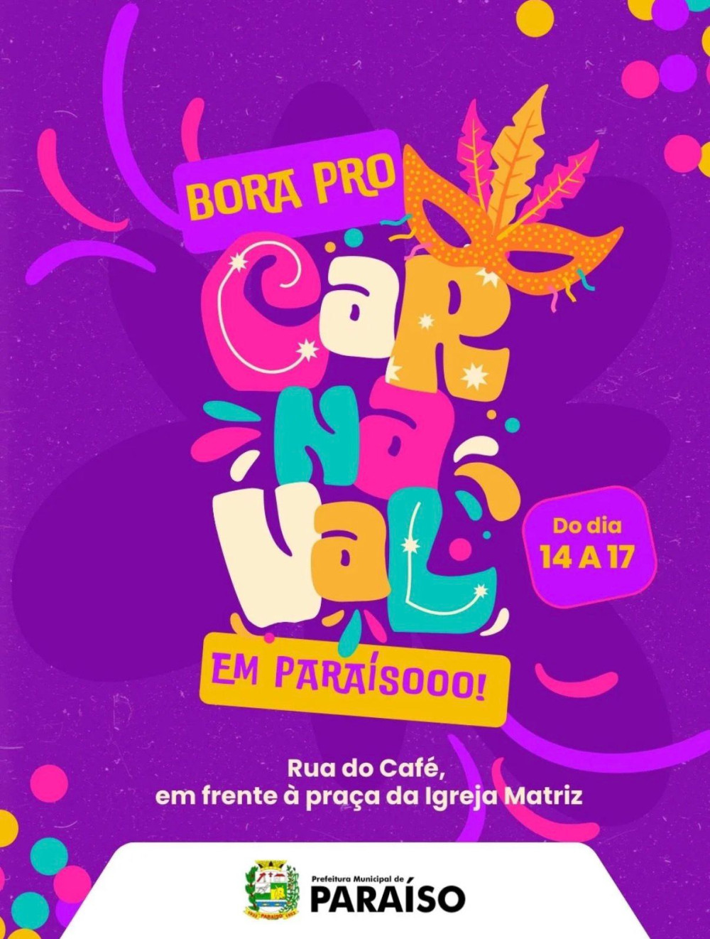 Paraíso em clima de festa!Entre os dias 14 a 17 de fevereiro, a cidade recebe uma programação com música, matinês e muita folia.É cultura, lazer e encontro.Arrasta para o lado para ver a programação.