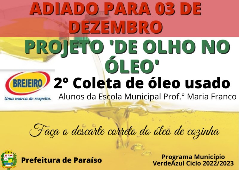 Coleta de óleo usado ‘De olho no óleo’ foi adiado para 03 dezembro.