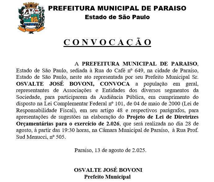 A PREFEITURA MUNICIPAL DE PARAISO, Estado de São Paulo, sediada à Rua do Café nº 649, na cidade de Paraíso, Estado de São Paulo, neste ato representada por seu Prefeito Municipal Sr. OSVALTE JOSÉ BOVONI, CONVOCA a população em geral, representantes de Associações e Entidades dos diversos segmentos da Sociedade, para participarem da Audiência Pública, em cumprimento do disposto na Lei Complementar Federal nº 101, de 04 de maio de 2000 (Lei de Responsabilidade Fiscal), em seu artigo 48 e respectivos parágrafos, para apresentações de sugestões na elaboração do Projeto de Lei de Diretrizes Orçamentárias para o exercício de 2.026, que será realizada no dia 28 de agosto, à partir das 19:30 horas, na Câmara Municipal de Paraíso, à Rua Prof. Sud Menucci, nº 505.