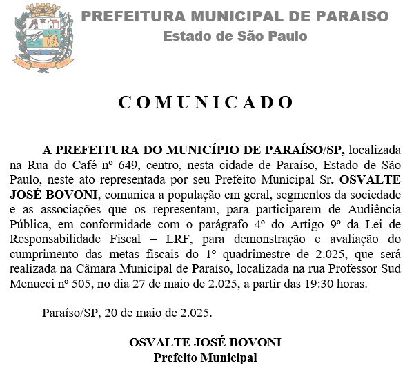 A PREFEITURA DO MUNICÍPIO DE PARAÍSO/SP, localizada na Rua do Café nº 649, centro, nesta cidade de Paraíso, Estado de São Paulo, neste ato representada por seu Prefeito Municipal Sr. OSVALTE JOSÉ BOVONI, comunica a população em geral, segmentos da sociedade e as associações que os representam, para participarem de Audiência Pública, em conformidade com o parágrafo 4º do Artigo 9º da Lei de Responsabilidade Fiscal – LRF, para demonstração e avaliação do cumprimento das metas fiscais do 1º quadrimestre de 2.025, que será realizada na Câmara Municipal de Paraíso, localizada na rua Professor Sud Menucci nº 505, no dia 27 de maio de 2.025, a partir das 19:30 horas.