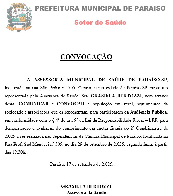 A ASSESSORIA MUNICIPAL DE SAÚDE DE PARAÍSO-SP, localizada na rua São Pedro nº 705, Centro, nesta cidade de Paraíso-SP, neste ato representada pela Assessora de Saúde, Sra. GRASIELA BERTOZZI, vem através desta, COMUNICAR e CONVOCAR a população em geral, seguimentos da sociedade e associações que os representam, para participarem da Audiência Pública, em conformidade com o § 4º do art. 9º da Lei de Responsabilidade Fiscal – LRF, para demonstração e avaliação do cumprimento das metas fiscais do 2º Quadrimestre de 2.025 a ser realizada nas dependências da Câmara Municipal de Paraíso, localizada na Rua Prof. Sud Menucci nº 505, no dia 29 de setembro de 2.025, segunda-feira, à partir das 19:30h.
