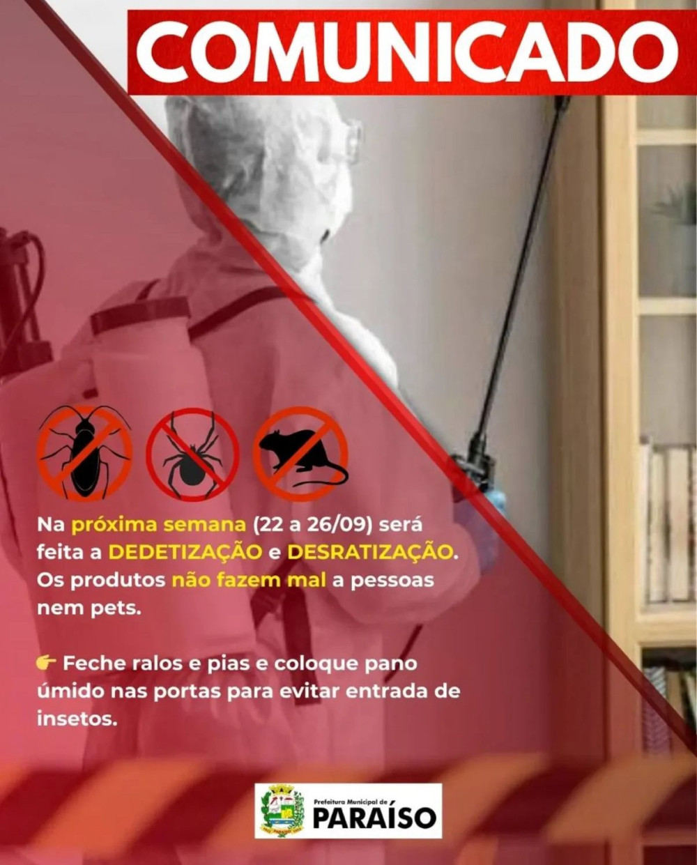 A Prefeitura de Paraíso informa que, entre os dias 22 e 26 de setembro, será realizada a dedetização e desratização em diferentes locais da cidade.