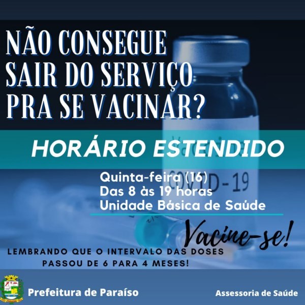 A Assessoria de Saúde realiza nesta quinta-feira (16) horário estendido para aplicação de doses da vacina contra a Covid 19, das 8 às 19 horas. Se você está com doses da vacina em atraso, e não consegue sair do serviço para se vacinar, aproveite nesta quinta-feira, e vacine-se! Leve a carteirinha de vacinação da Covid e CPF. Lembrando que o intervalo de uma dose para outra passou de 6 para 4 meses. A vacinação é muito importante!