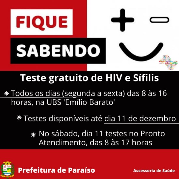 Os testes ficarão disponíveis até dia 11 de dezembro, na UBS ‘Emílio Barato’, das 8 ás 16 horas. No sábado, dia 11, no Pronto Atendimento, das 8 às 17 horas.