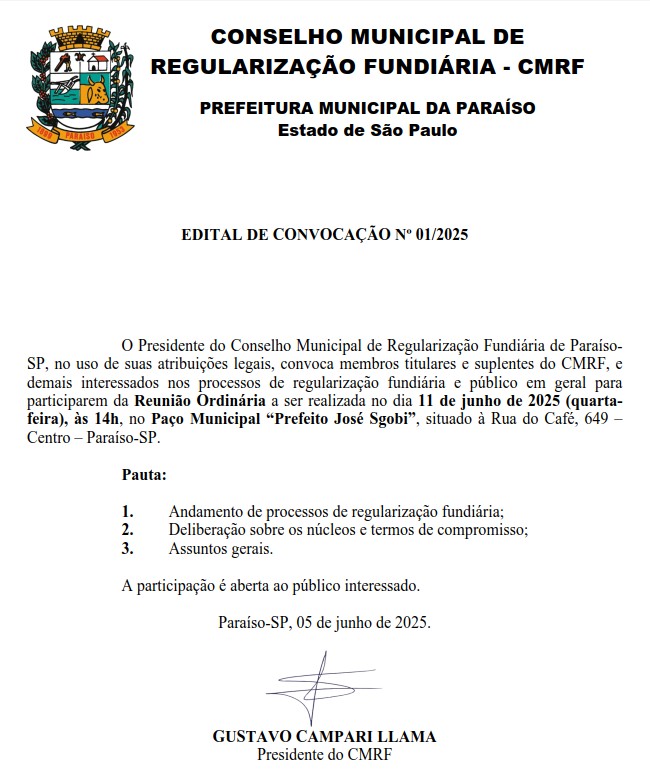 O Presidente do Conselho Municipal de Regularização Fundiária de Paraíso-SP convoca membros titulares e suplentes do CMRF, além de demais interessados nos processos de regularização fundiária e público em geral, para participarem da Reunião Ordinária no dia 11 de junho de 2025 (quarta-feira), às 14h, no Paço Municipal "Prefeito José Sgobi", situado à Rua do Café, 649 - Centro - Paraíso-SP.