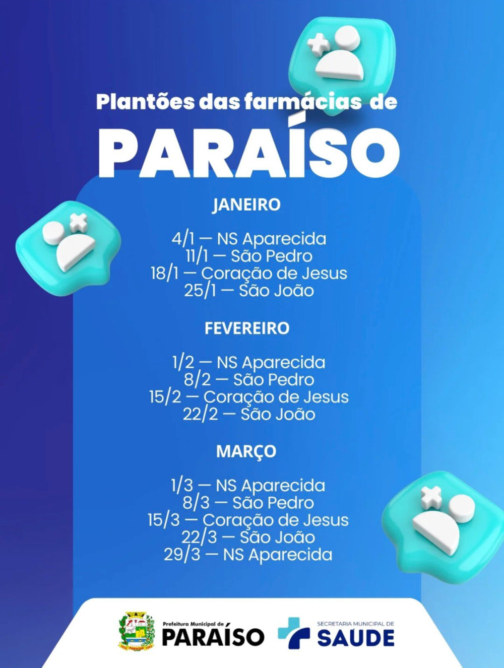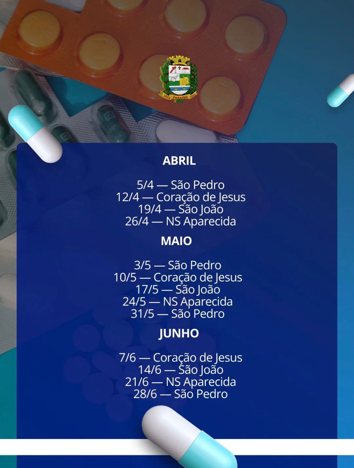 A Prefeitura Municipal, em conjunto com a Secretaria Municipal de Saúde, informa a escala de plantões das farmácias do município, organizada por datas e meses, com o objetivo de garantir o acesso contínuo da população aos serviços farmacêuticos.