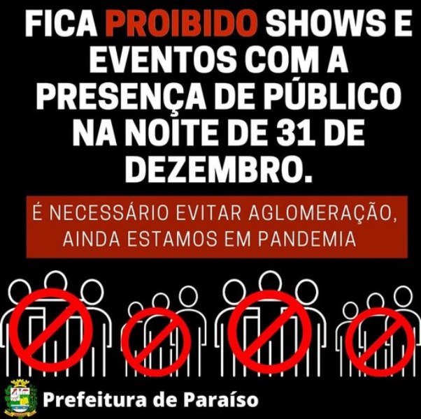 A Prefeitura de Paraíso informa que ficará proibido shows ou qualquer outro evento com a presença de público na noite de 31 de dezembro.
