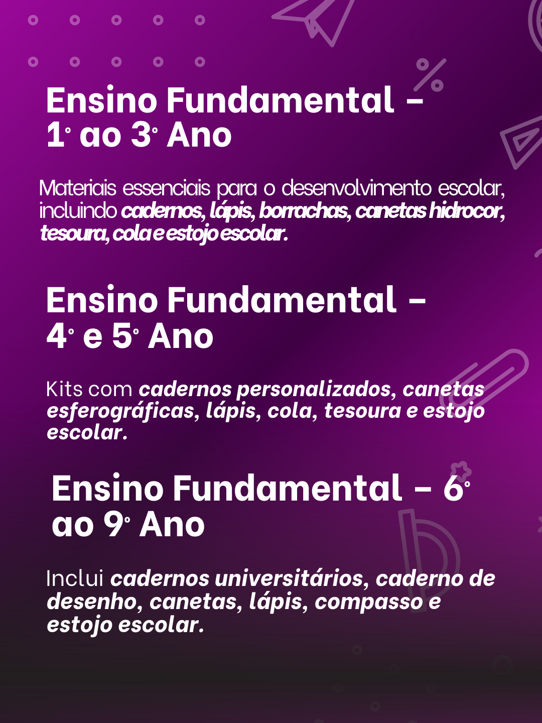 A Prefeitura de Paraíso, por meio da Secretaria Municipal de Educação, informa a composição dos kits escolares destinados aos alunos da Educação Infantil e do Ensino Fundamental, conforme cada etapa de ensino.