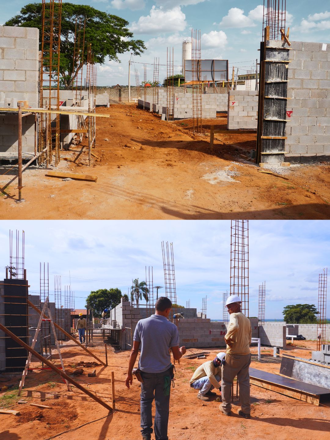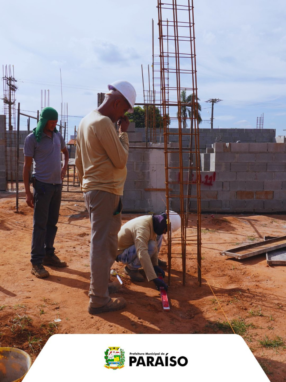 A construção da creche escola em Paraíso segue avançando, com equipes atuando no local e evolução contínua dos trabalhos.