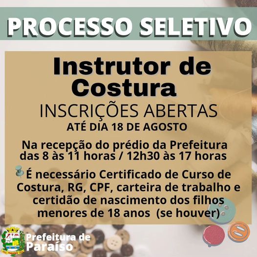 As informações completas no link: https://www.paraiso.sp.gov.br/processos-seletivos/processo-seletivo-0032023-instrutor-de-costura