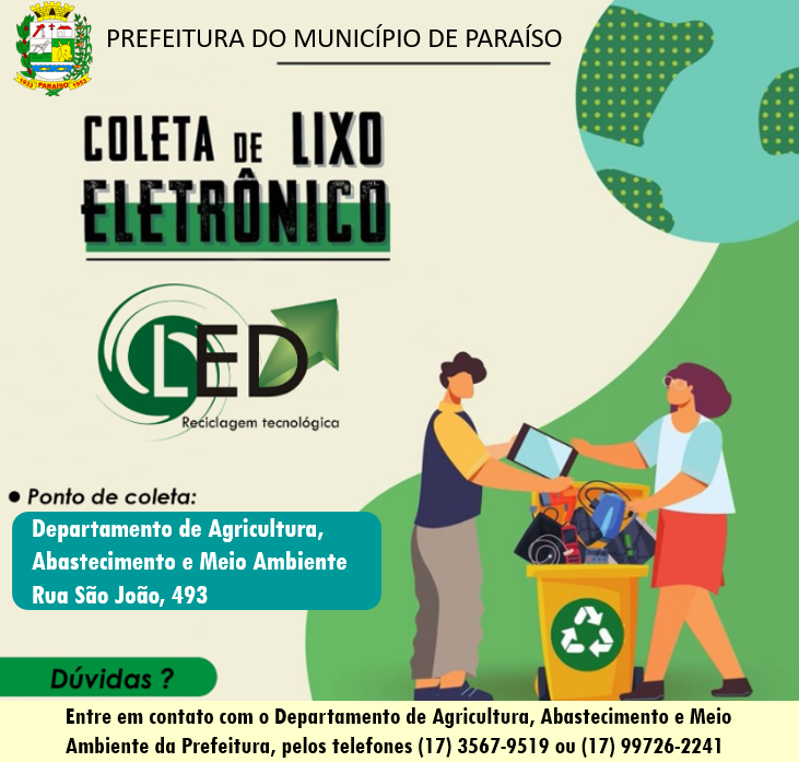 A Prefeitura de Paraíso, por meio do Departamento de Agricultura, Abastecimento e Meio Ambiente, está promovendo uma campanha de coleta de lixo eletrônico, com o objetivo de oferecer um destino seguro e ambientalmente correto para materiais eletrônicos fora de uso. O descarte inadequado desses equipamentos pode causar sérios danos ao meio ambiente e à saúde pública, devido à presença de metais pesados e outros componentes tóxicos.