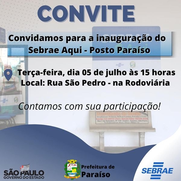 A parceria entre a Prefeitura de Paraíso e o Sebrae traz para o município um importante canal de atendimento para a população, o Sebrae Aqui - Posto Paraíso, e na terça-feira (5) será a inauguração, às 15 horas.