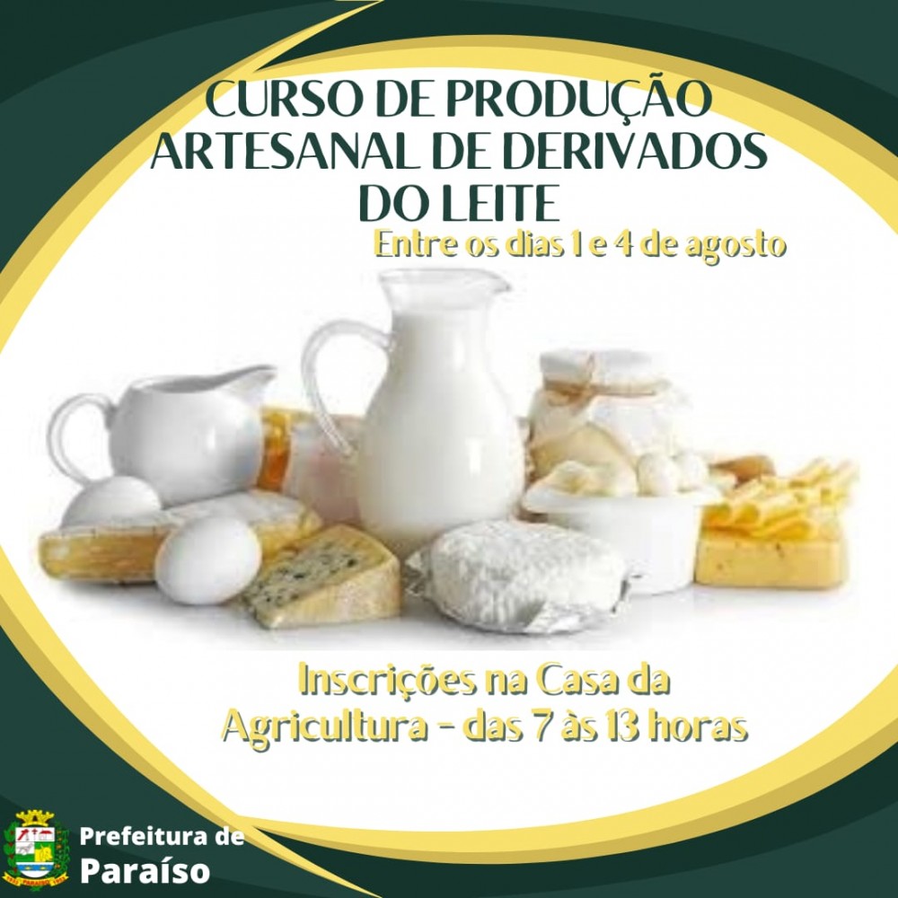 A Prefeitura de Paraíso, por meio da Casa da Agricultura e Assessoria de Agricultura e Meio Ambiente, em parceria com o Serviço Nacional de Aprendizagem Rural (Senar) realiza o curso de Produção Artesanal de derivados do leite, entre os dias 1 e 4 de agosto, das 8 às 16 horas, na Cozinhalimento. Para participar do curso, basta fazer a inscrição na Casa da Agricultura, das 7 às 13 horas, levar o RG e CPF.