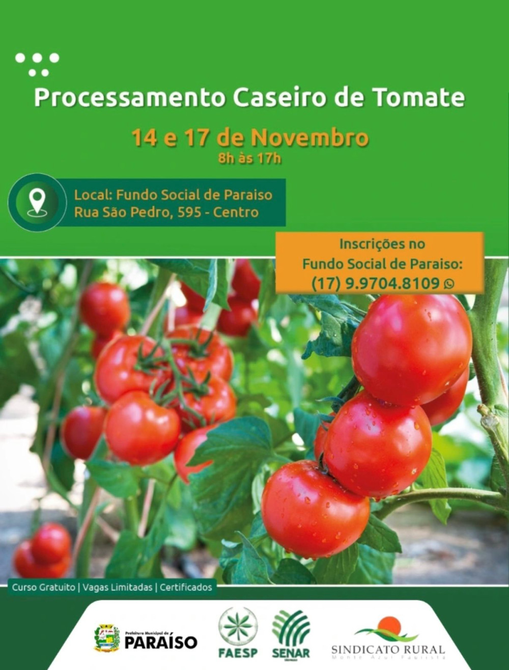 O curso gratuito de Processamento Caseiro de Tomate acontece no dia 14 e 17 de novembro, das 8h às 17h, no Fundo Social de Paraíso (Rua São Pedro, 595 - Centro) .