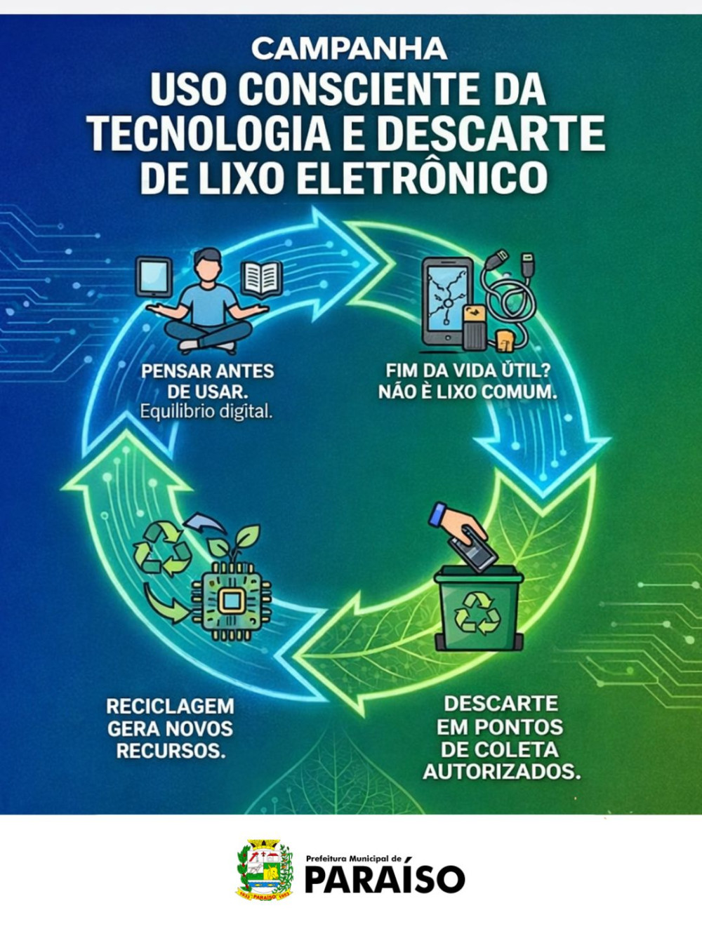 A Prefeitura de Paraíso realiza a campanha de Uso Consciente da Tecnologia e Descarte Correto de Lixo Eletrônico.