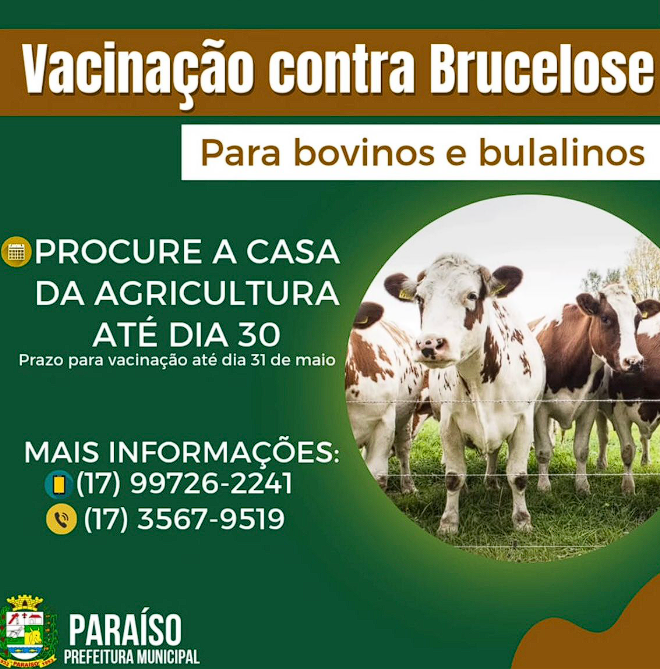 Procure a Casa da Agricultura até o dia 30 (prazo para vacinação até dia 31 de maio) para regularizar a vacinação do seu rebanho e garantir a saúde animal e a segurança sanitária da nossa região.