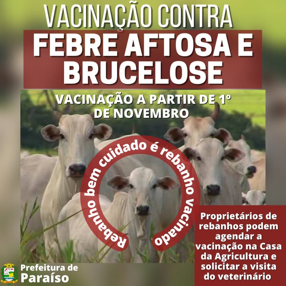 A Prefeitura de Paraíso, através da Casa da Agricultura, dará início à campanha de vacinação contra a Febre Aftosa e a Brucelose no próximo dia 1º de novembro.